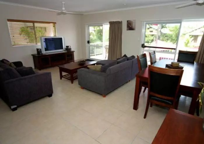 This penthouse apartment sits just across the road from Wongaling Beach with two private balconies overlooking the pool and between the coconut trees you catch glimpses of Dunk Island.