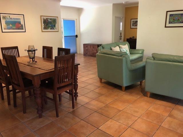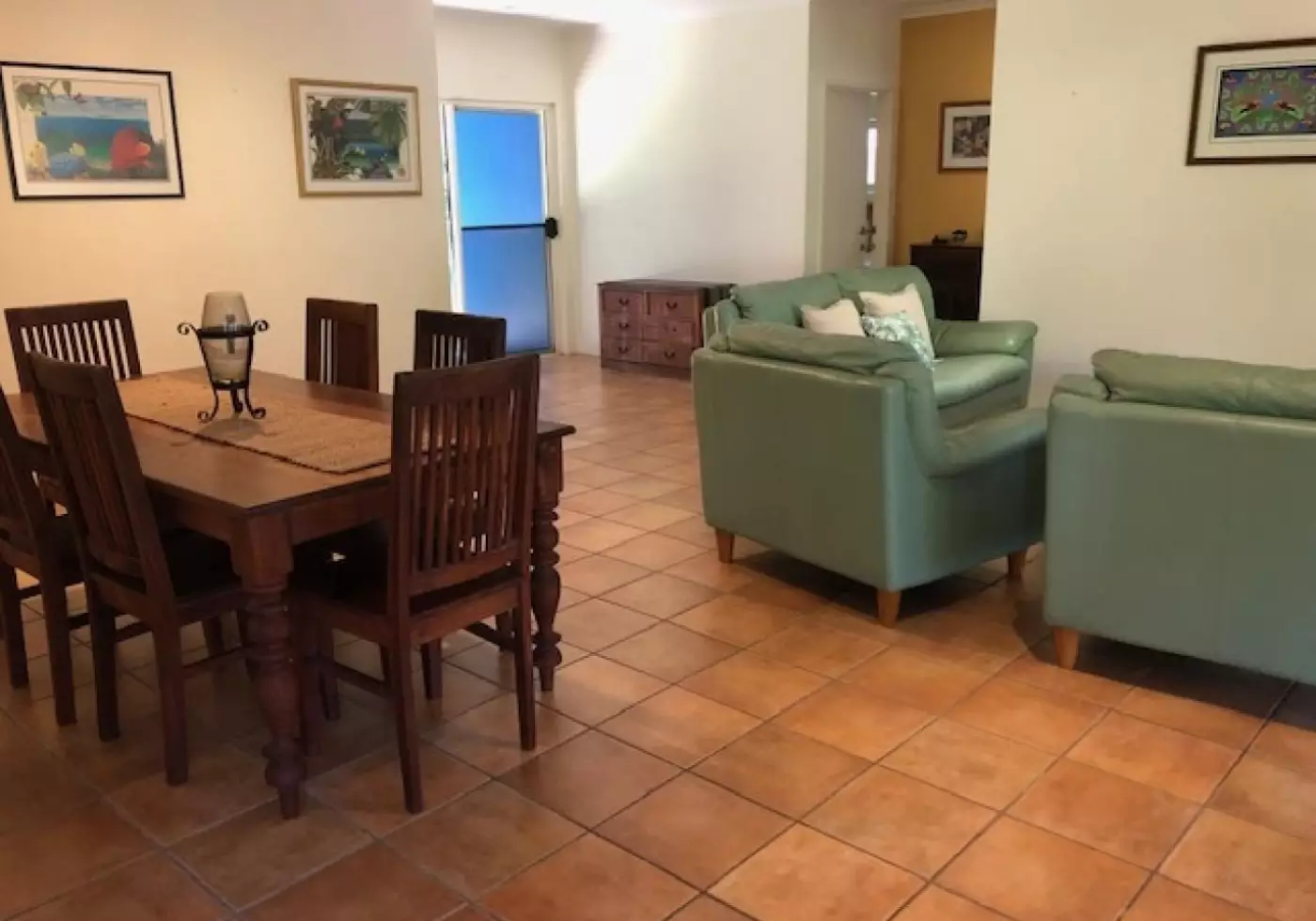 The open plan living area encompassing the kitchen, lounge and dining area flow onto a huge undercover patio and the grassed garden surrounded by tropical gardens.