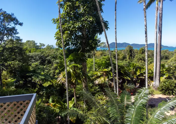 * Outdoor balcony with ocean and island views overlooking tropical gardens