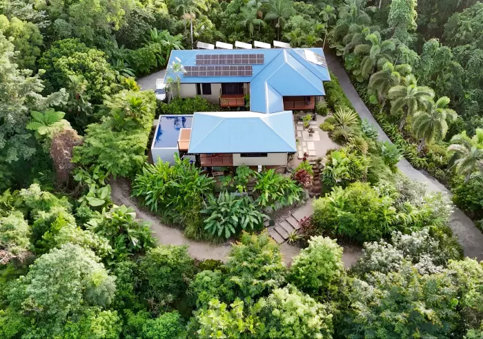With a concealed entrance just off Mission Circle, follow the concrete driveway into the property and marvel at the lush green rain forest and eagerly await to discover this hidden gem. A fully self contained shed is your first stop - It was lived in when the construction was underway and is complete with a kitchen and bathroom.  (Currently de-commissioned but great for large storage needs such as boats and caravans).