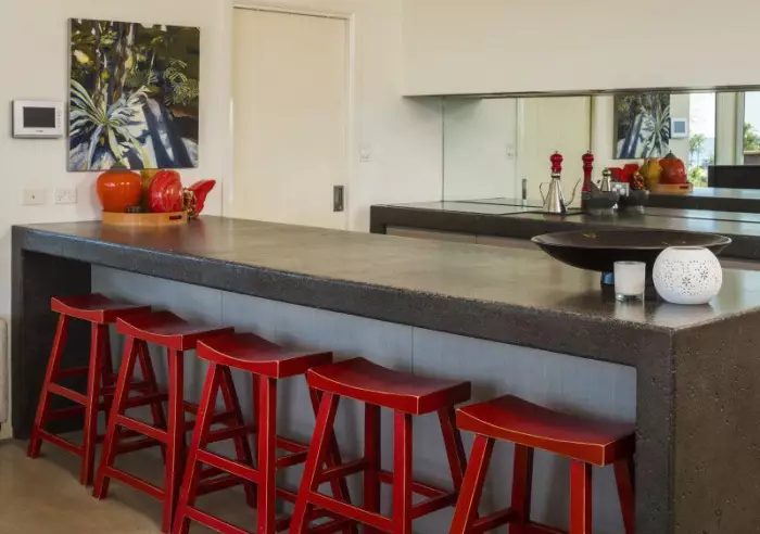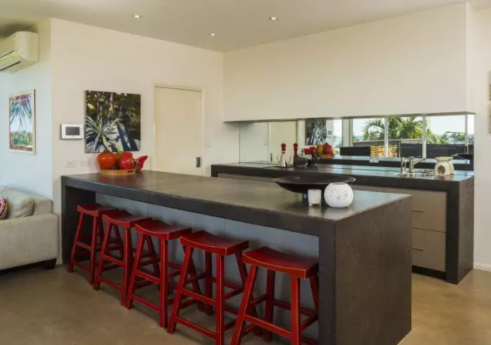 The kitchen has polished concrete benches under which there are drawers to store crockery, utensils, pots and pans. There is a walk in pantry with sink, fridge and dishwasher.