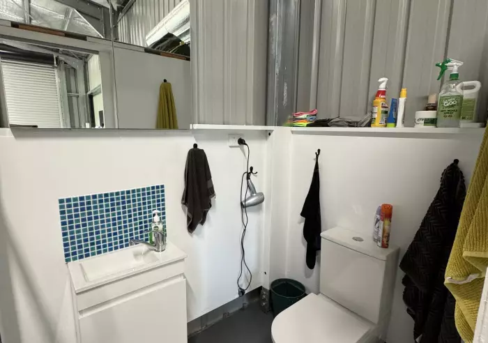 The shed is 9m x 5m in size, with a 3 meter wide roller door that's 3.3m high. The roof is insulated with 2 whirlybirds.  A bathroom has been added with toilet, shower and basin plus there's a washing machine and TV with aerial that's included in the sale.  A shade sail has also been added on the western side.