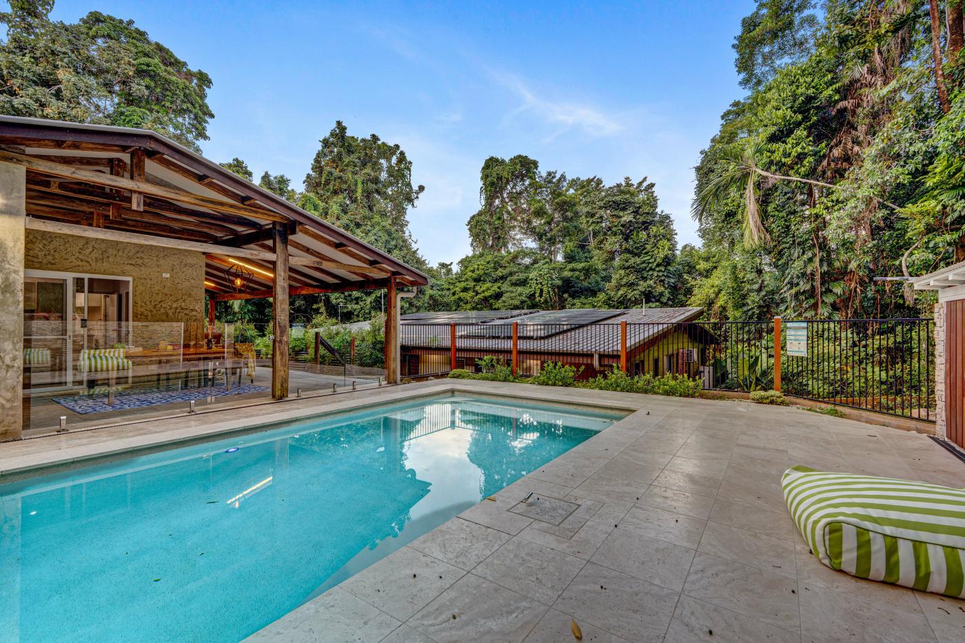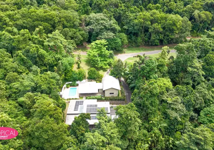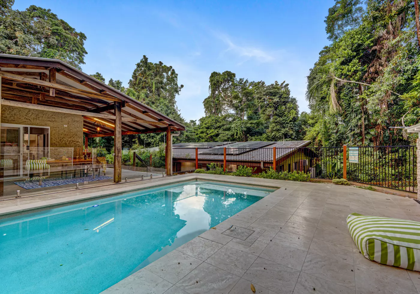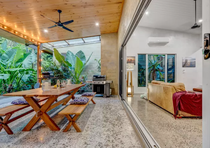 From the polished concrete floors to the recycled timber features, you'll marvel at the clever design and attention to detail thoughout this fully air-conditioned, tropical masterpiece.  You'll love the outdoor entertainment area with kitchen overlooking the rainforest with large elephant ear plants!