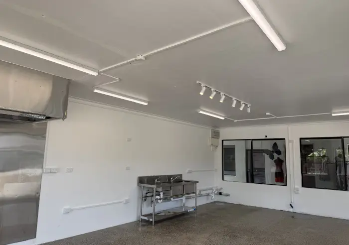 Inside is an open area of 48m2  equipped with sink, grease trap & exhaust fans.  Complete with outdoor front courtyard which faces Porter Promenade and ample parking at the rear for customers.