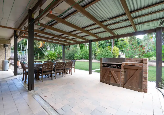 The rear of the home is an entertainer’s dream, with a large covered patio, bar area, BBQ zone and a servery connecting directly to the kitchen, making hosting effortless. A dedicated deck is already in place for an above-ground pool, completing the relaxed outdoor setup.