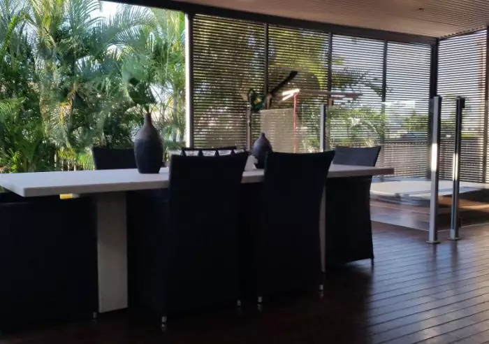Three of the five bedrooms and a bathroom are located at the entrance of the home and an additional bedroom and bathroom are at the rear of the home. The main bedroom has an ensuite with an outdoor bath and walk in robe.