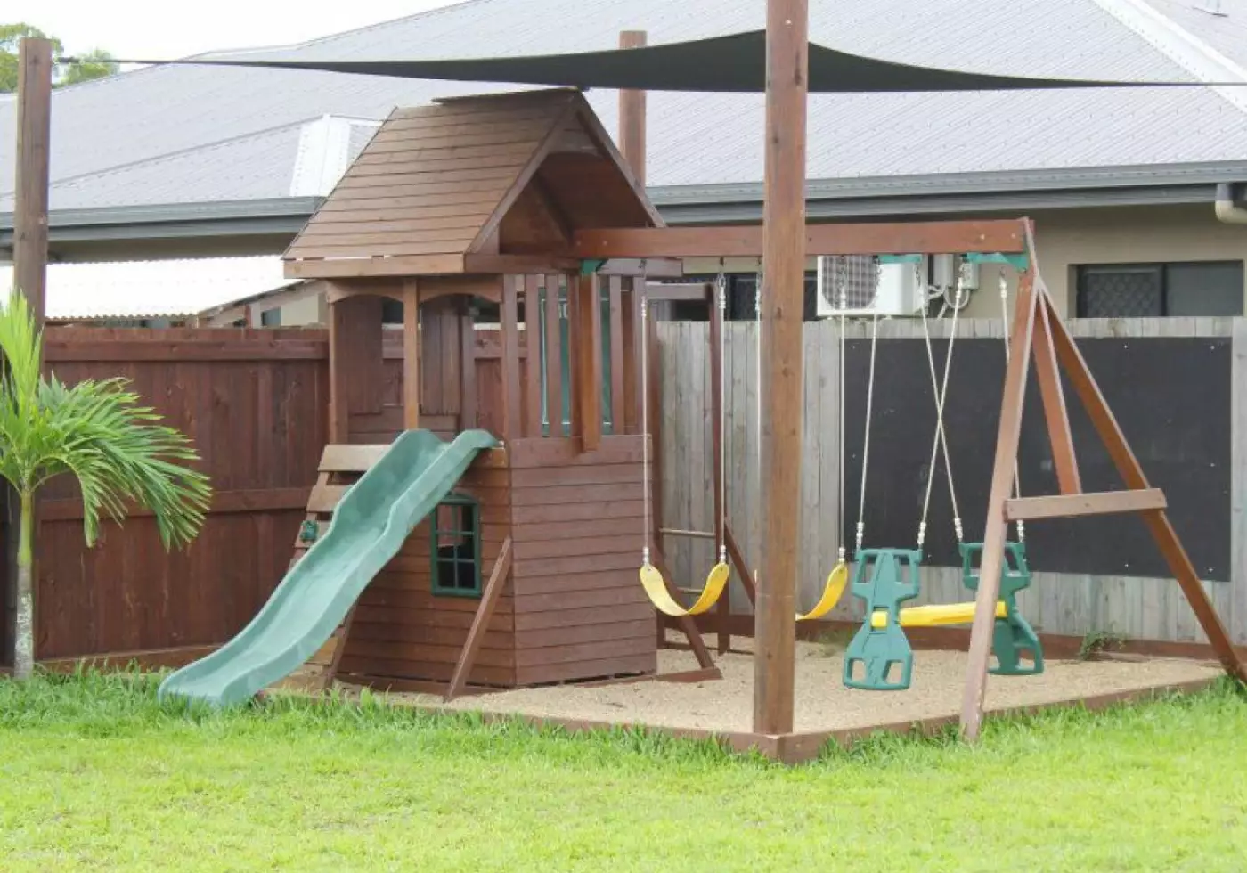 Double lock-up/remote control garage, covered storage area, custom made kids playground and all that room on the front of the block. It's available soon for a loving family!
