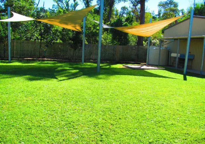 Shade clothes cool the grassed backyard and the sand pit. The boat will fit in the 2 bay shed / workshop and a fish cleaning trough for the mackerel after a hard day out on the water.